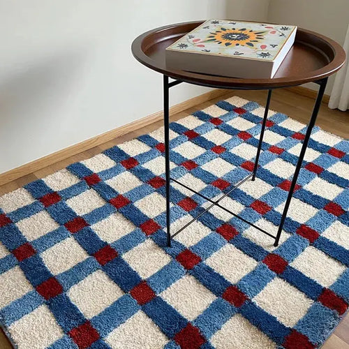 Blue And Red Checkered Tufted Grid Rug